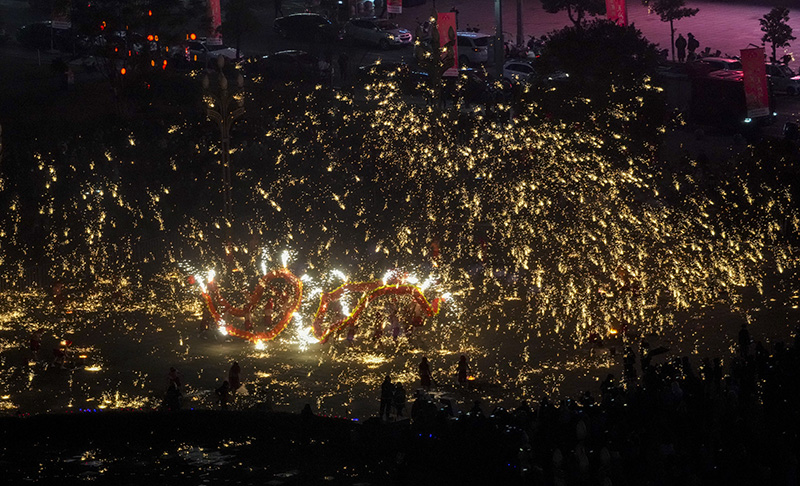重慶市銅梁區的龍城天街的廣場上,銅梁火龍隊的隊員們表演銅梁火龍。銅梁火龍隊的隊員們表演銅梁火龍。重慶市銅梁區的龍城天街的廣場上,銅